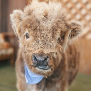 Mabel was born March 2024. She and Penny have a playful relationship. While she was a great reindeer for Santa pictures, she will be retired until she is old enough to be a mom.